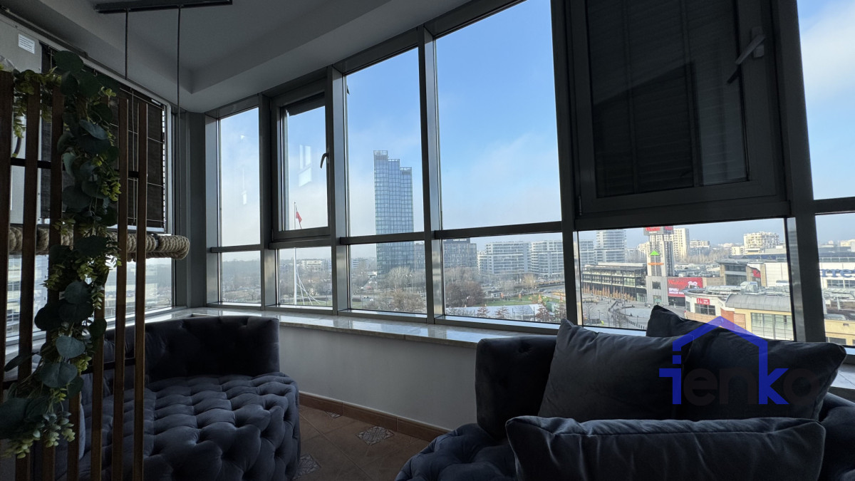 Wnętrze jest jasne i bardzo dobrze doświetlone, z panoramicznym widokiem na Warszawę. Na podłogach położono wysokiej jakości gres oraz drewniany parkiet, ściany wykończone są okleiną winylową. Apartament wyposażony jest w stylowe oświetlenie, dębowe meble (antyki oraz elementy na zamówienie) oraz designerską klimatyzację. Kuchnia w pełni zabudowana i wyposażona. Dodatkowo przygotowana infrastruktura pod sieć i serwer.