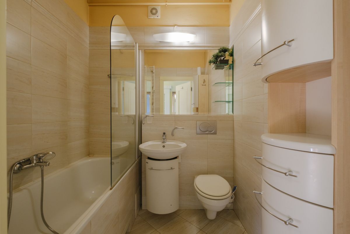 Łazienka posiada wystarczająco dużo miejsca na wannę czy zastąpienie jej komfortowym prysznicem typu walk-in.