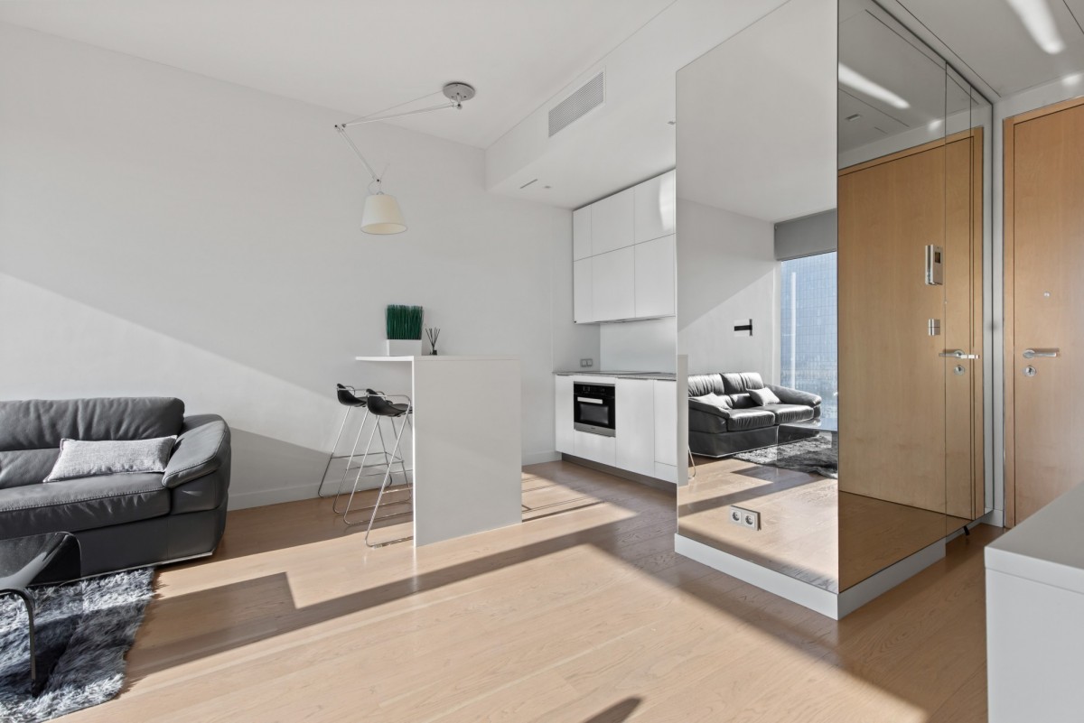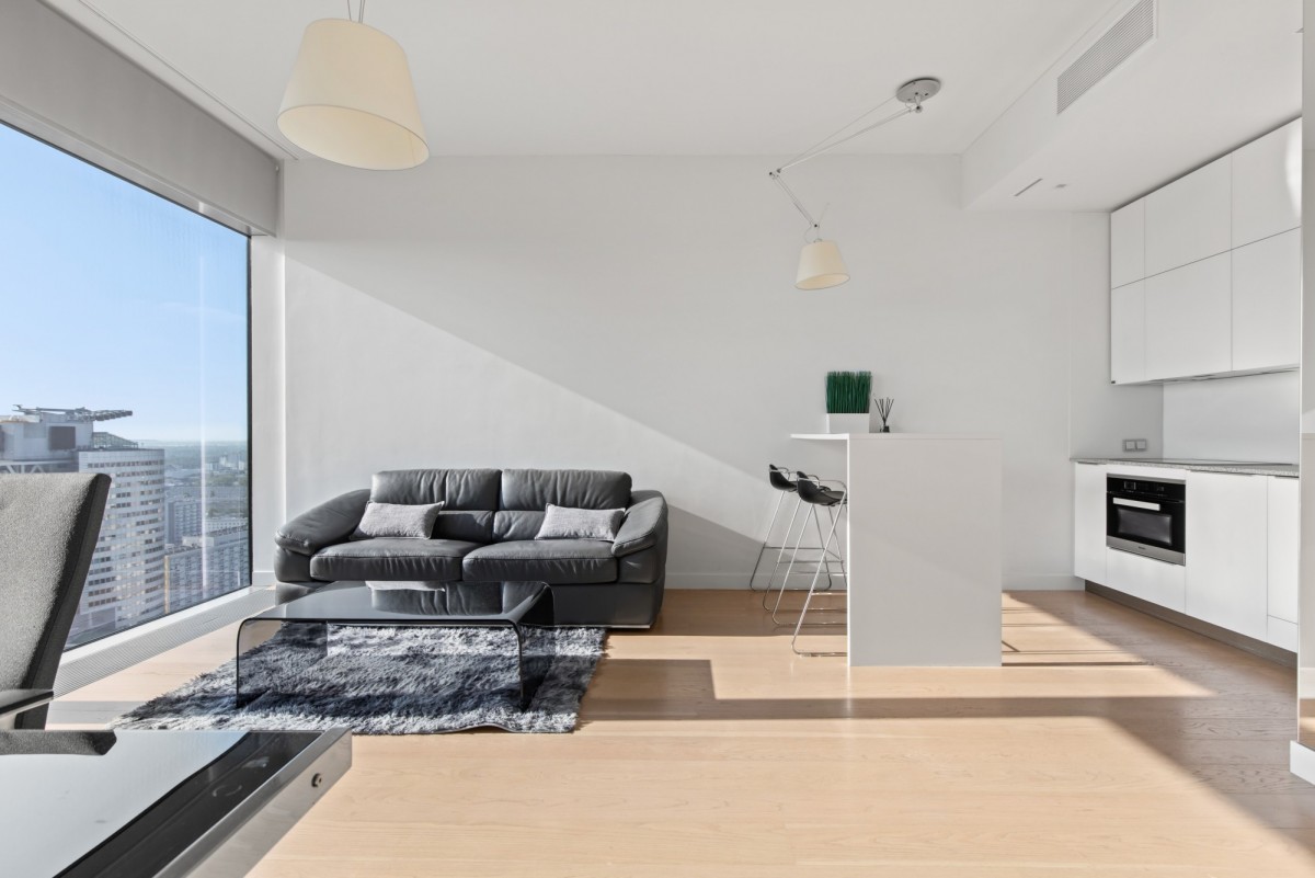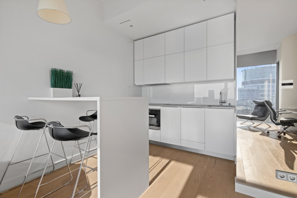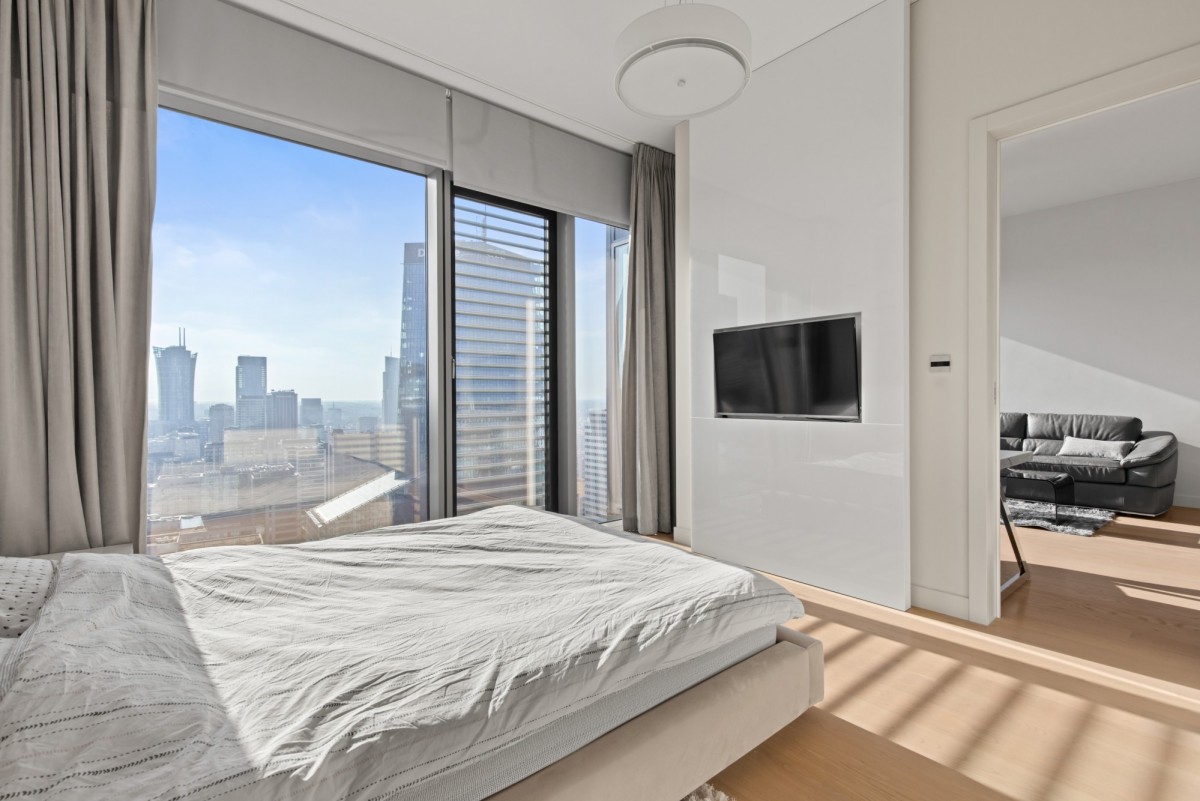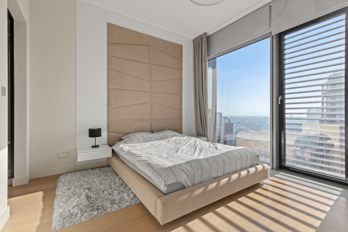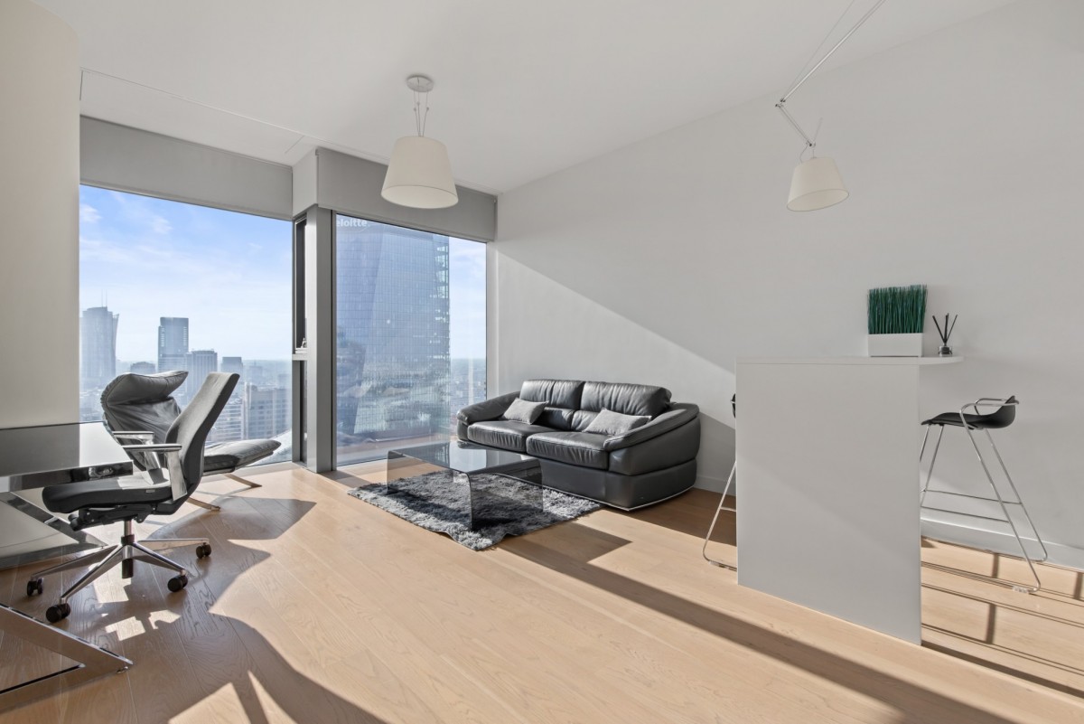 We offer for rent an exclusive 2-room apartment with an area of 53 m², located on the 27th floor of the prestigious Cosmopolitan building in the heart of Warsaw. The apartment offers a direct view of the city skyline.