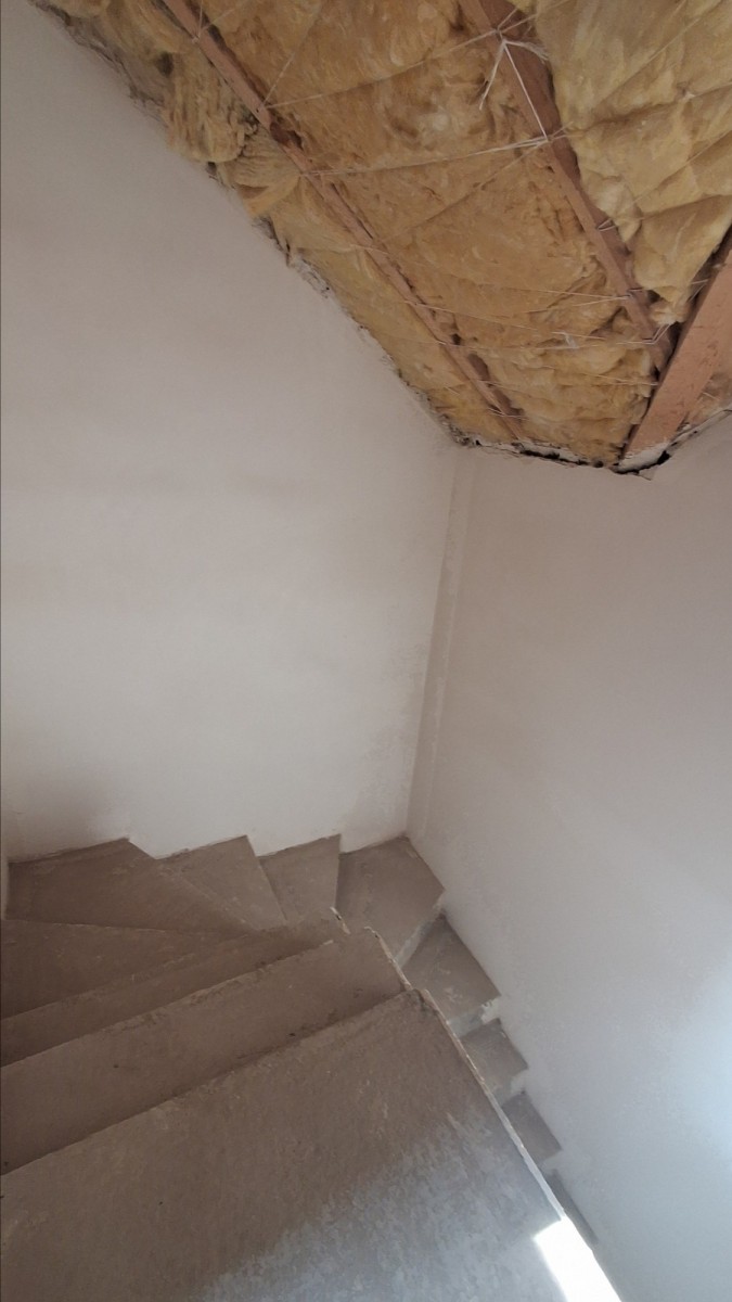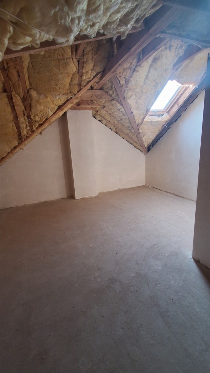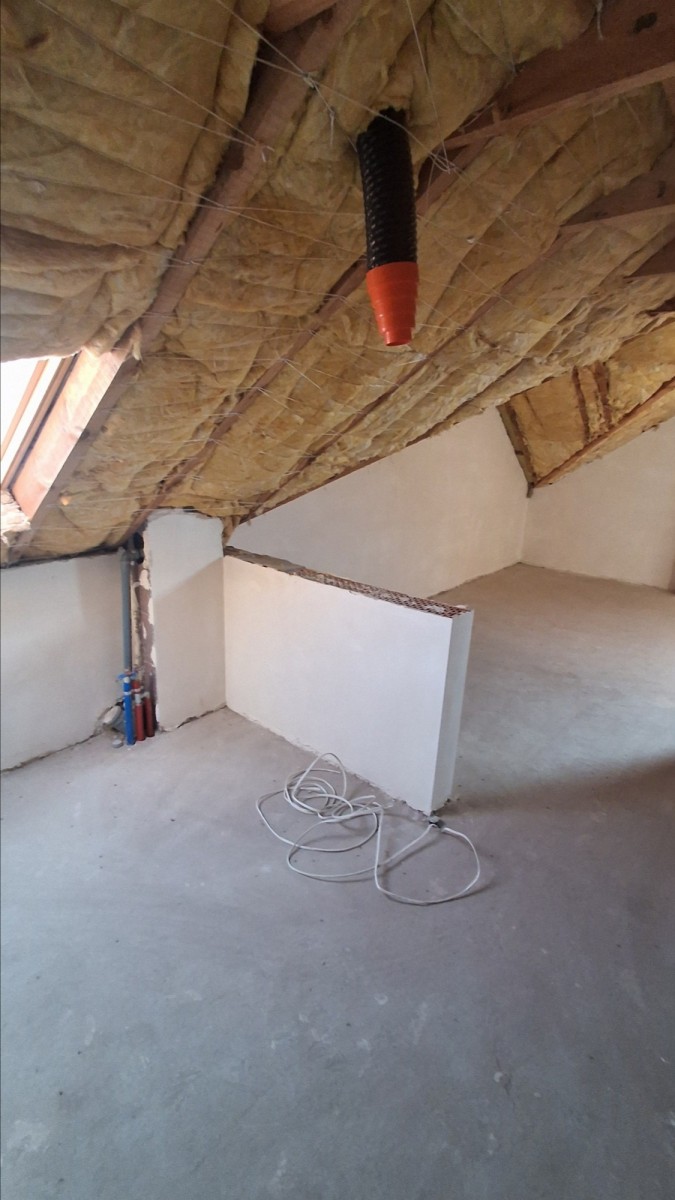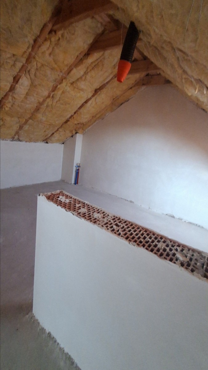 * strych z pierwszą warstwą wełny między krokwiami